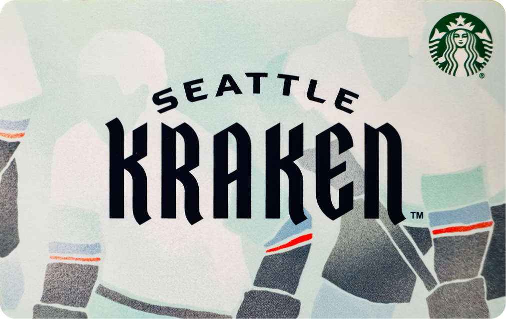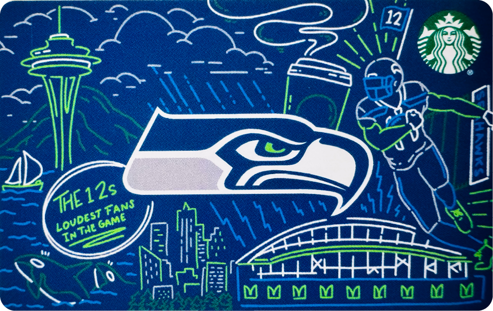 our cities beloved sports organizations. Namely the Seattle Seahawks and Seattle Kraken. Once a year we rub elbows with the brilliant creative minds at these iconic brands and co-brand a Starbucks Card offered exclusively to our local customers and fans. Celebrating coffee, sport and a shared passion for our regions rich heritage and mystique,